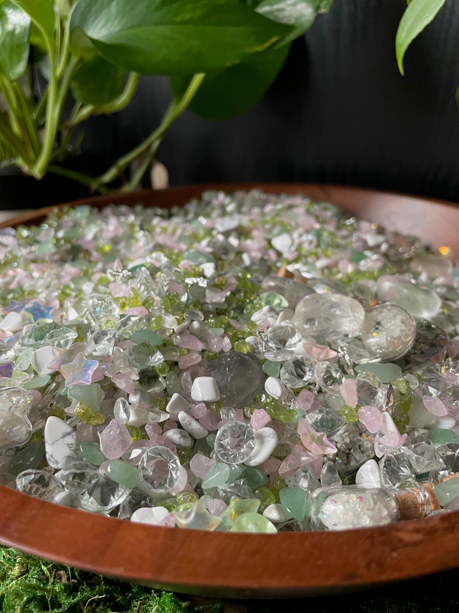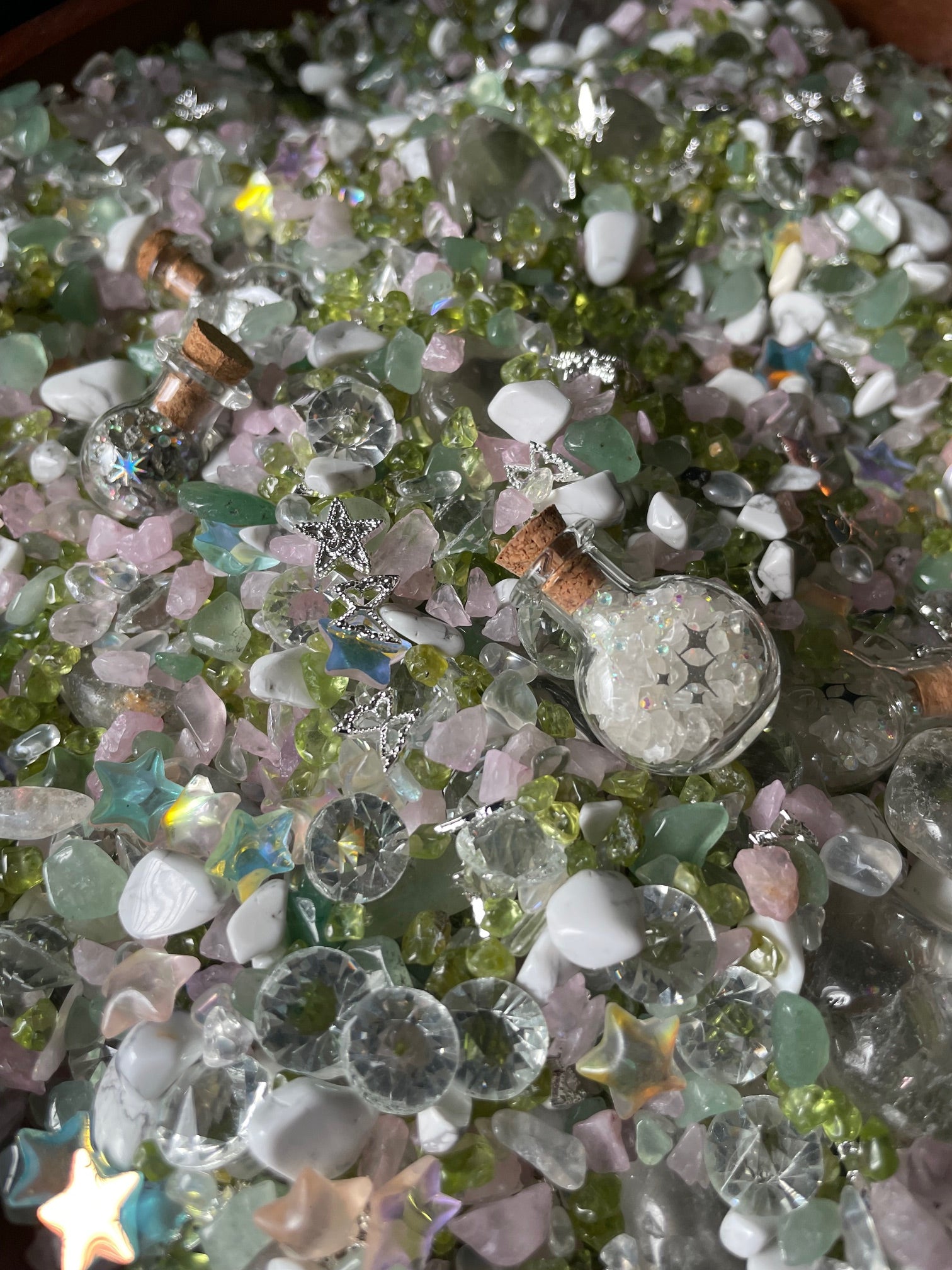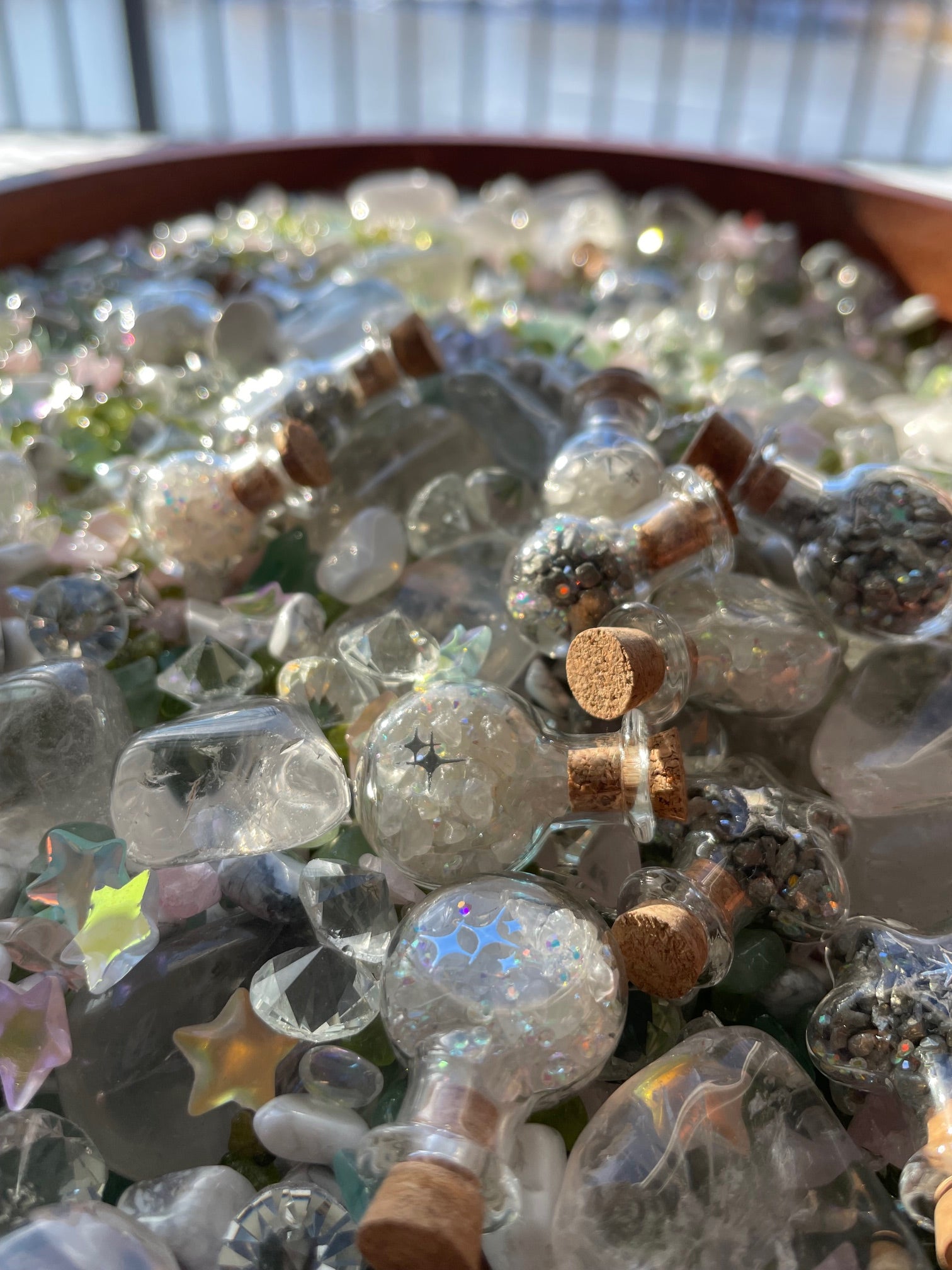 Iridescent streams wind through the undergrowth of the forest. Beneath the surface of these waters lie smooth, colorful gems—peridot, quartz, aventurine. Nestled among the gems are tiny glass vials — wishes! When someone kneels beside the stream and speaks a wish aloud with sincerity, the water captures the intention, condenses it into light, and forms a glass vial that fills with crystals formed by the power of intention. These vials float at the surface of the water until a fairy taps it with their wand, magnifying the intention within and setting it in stone — which sends the vials down into the water to sit in the stream-beds amongst the colorful gems. It’s considered good luck to capture a wish vial!