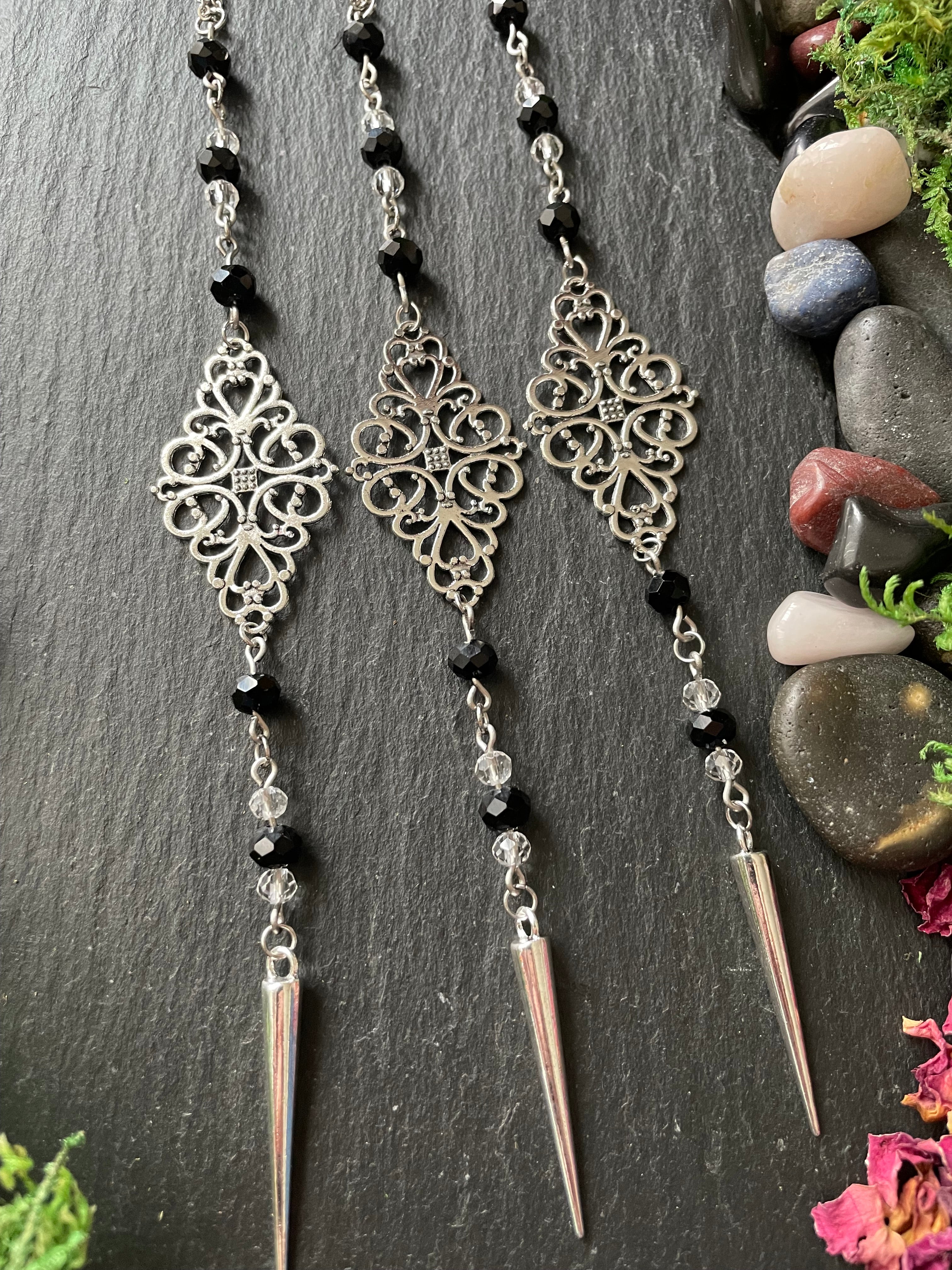 Dark stone walls wrapped in ivy, pointed arches reaching skyward, and narrow stained-glass windows that glow faintly at dusk. Spired towers loom above the treetops. At night, lanterns flicker to life within, casting warm amber light.